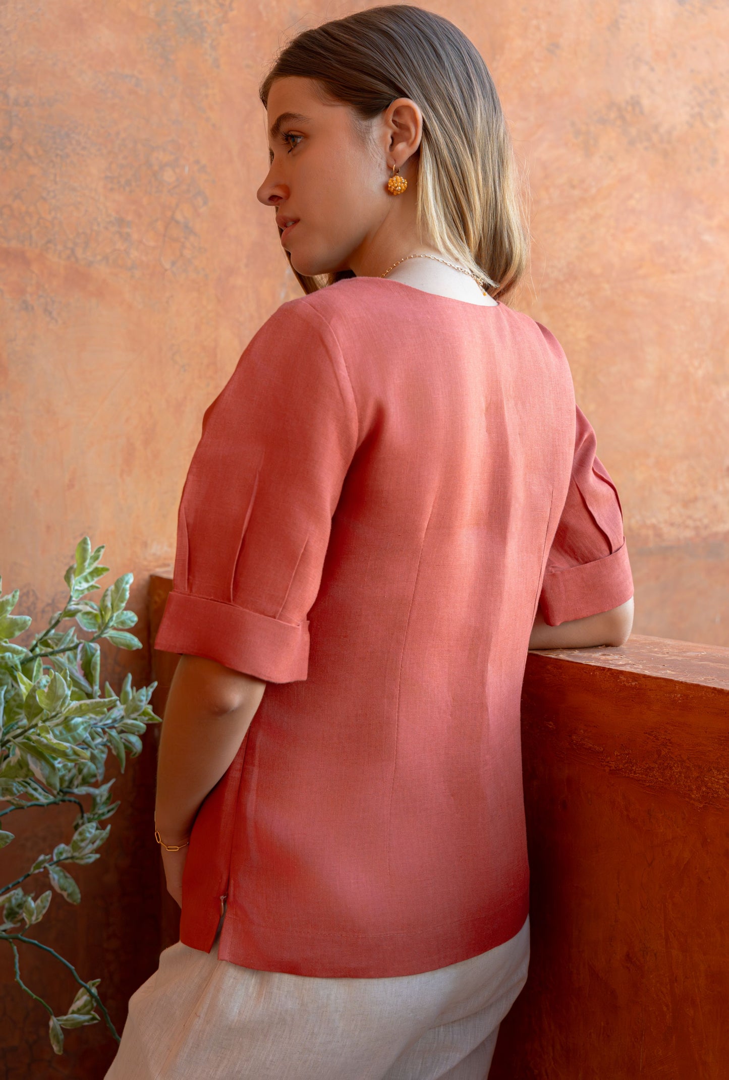 Blusa Daelis en lino 100% en color terracota.