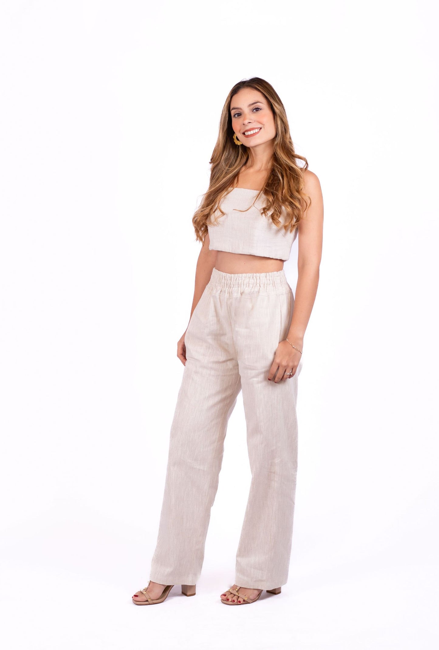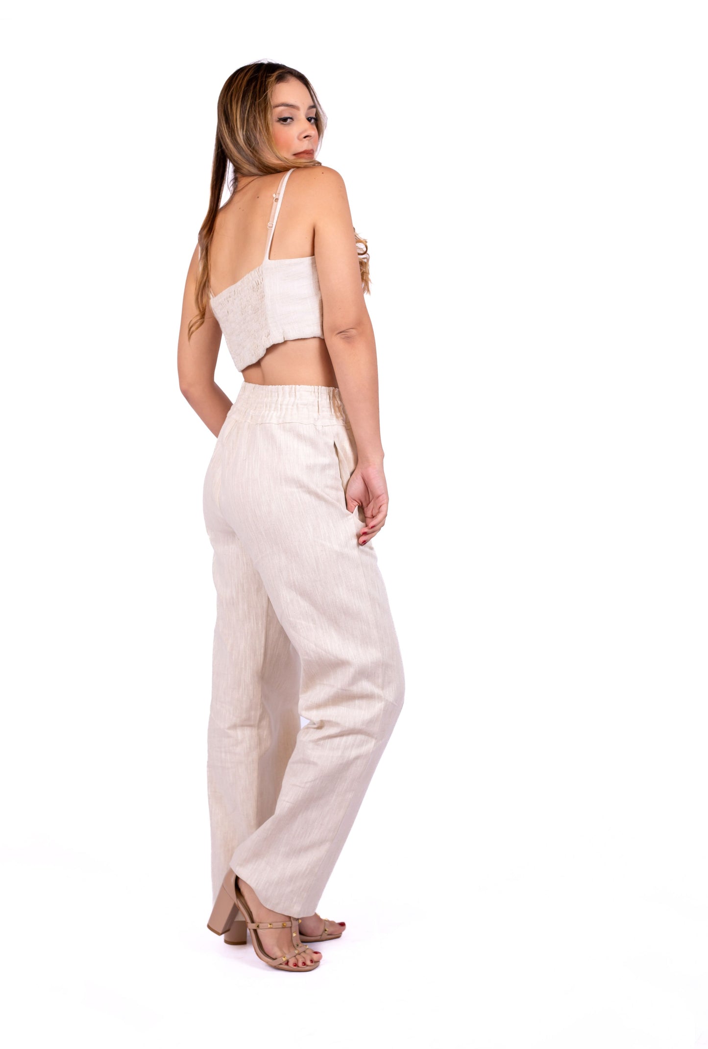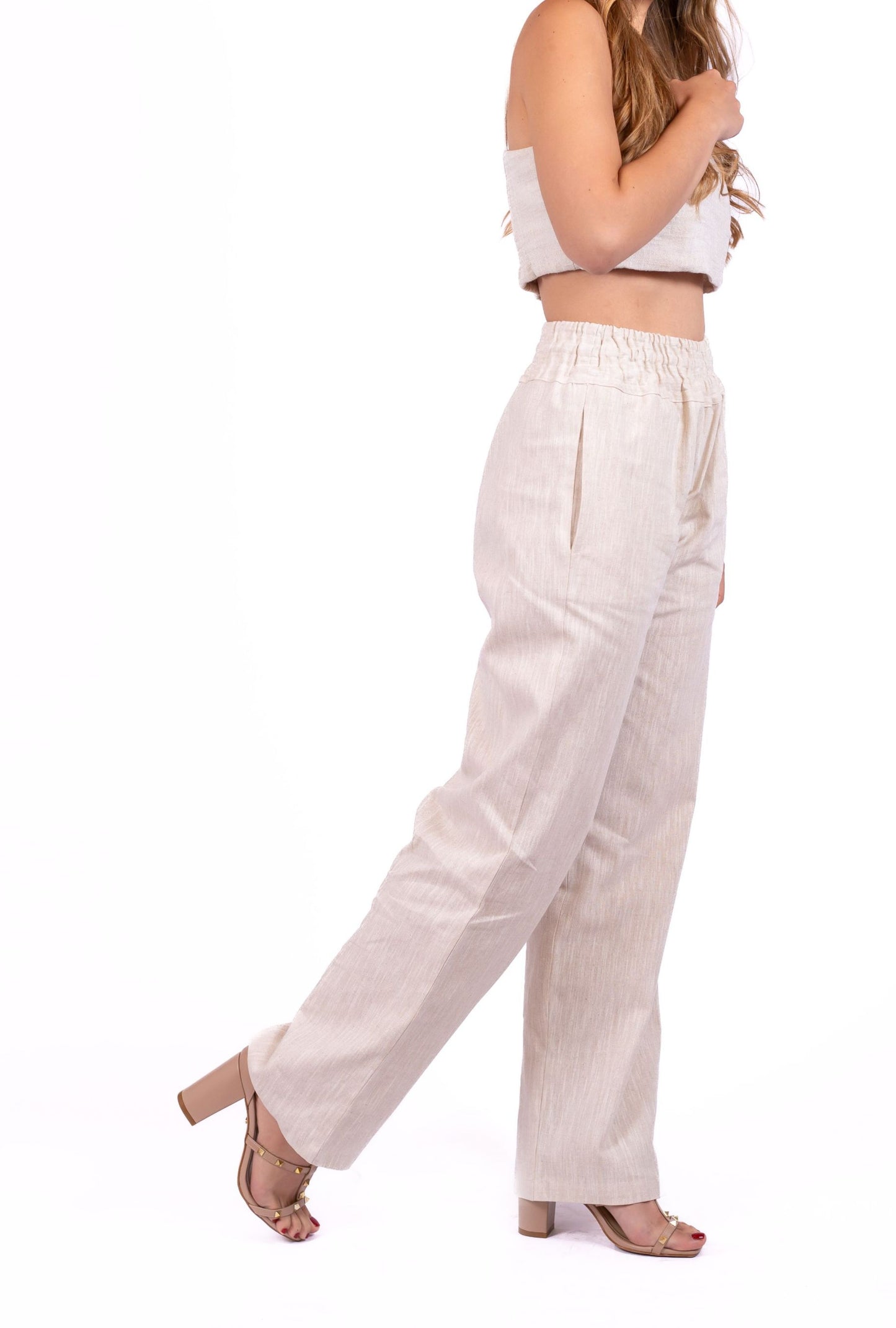 Pantalón Lisboa en lino 100% casual y relajado con un ajuste perfecto gracias al elástico en la cintura. Un básico cómodo y versátil